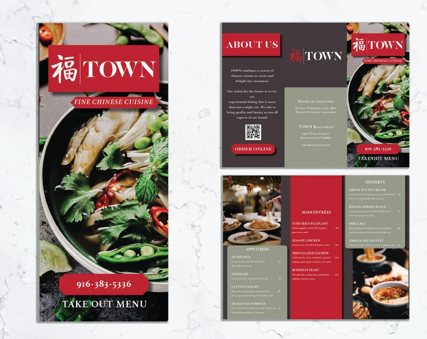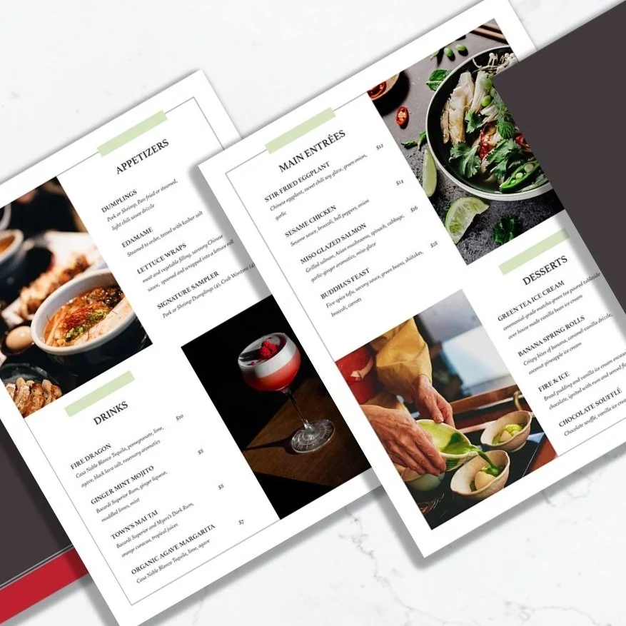 For this mock upscale brand, I focused on elevating the traditional dining and takeout experience through sophisticated layout design. Based on peer feedback, I refined the visual hierarchy by simplifying the internal pages and unifying the color palette with the brand’s tri-fold brochure. This project sparked my passion for layout design—balancing high-end imagery with precise typography to ensure the menu items remain the focal point.
